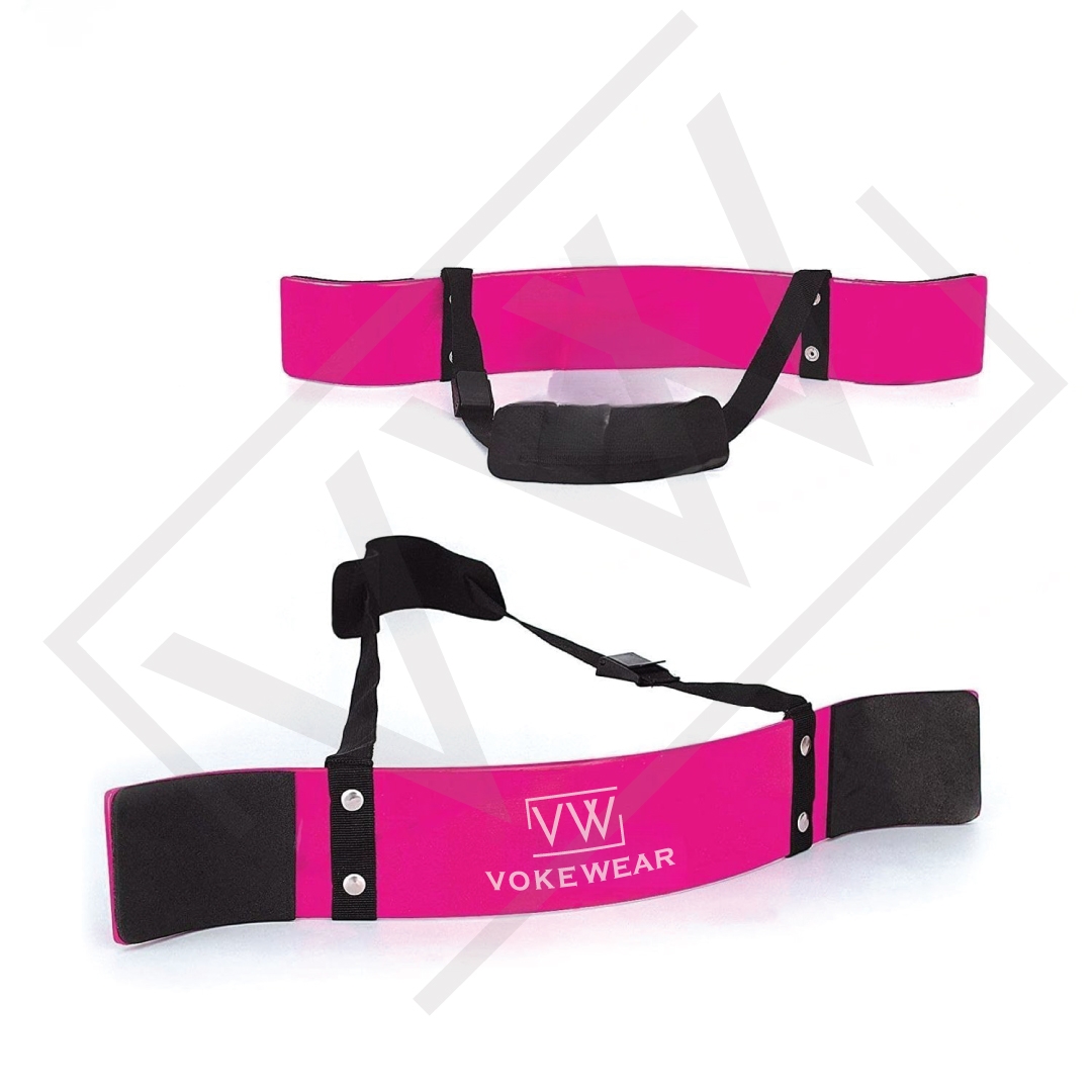 -Webbed nylon belt, a thick, oversized neoprene neck pad, and dense elbow pads